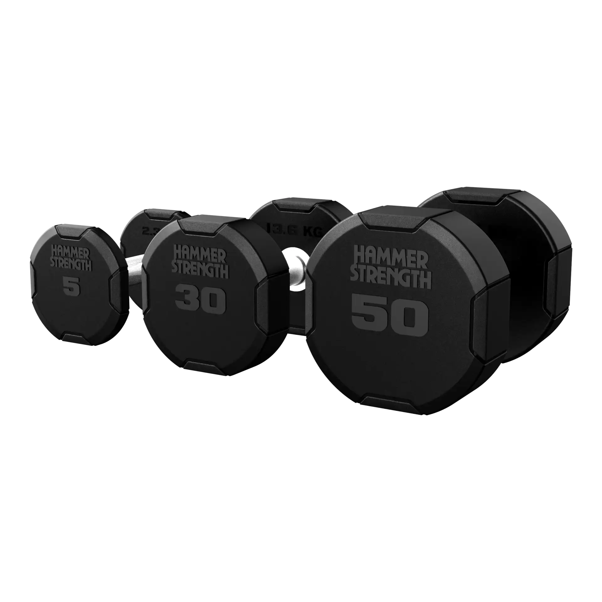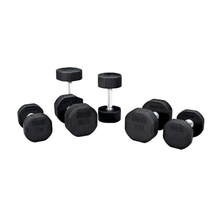 Boasting a high-quality, tough rubber construction and a premium look and feel, Hammer Strength 4-Sided Rubber Dumbbells are designed for busy gym floors.