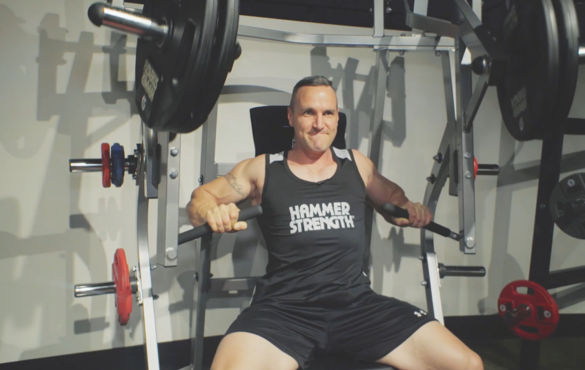 In this first video, Tim completes a chest workout consisting of bench press, dumbbell flyes and an isolateral incline press performed on the Hammer Strength machine.